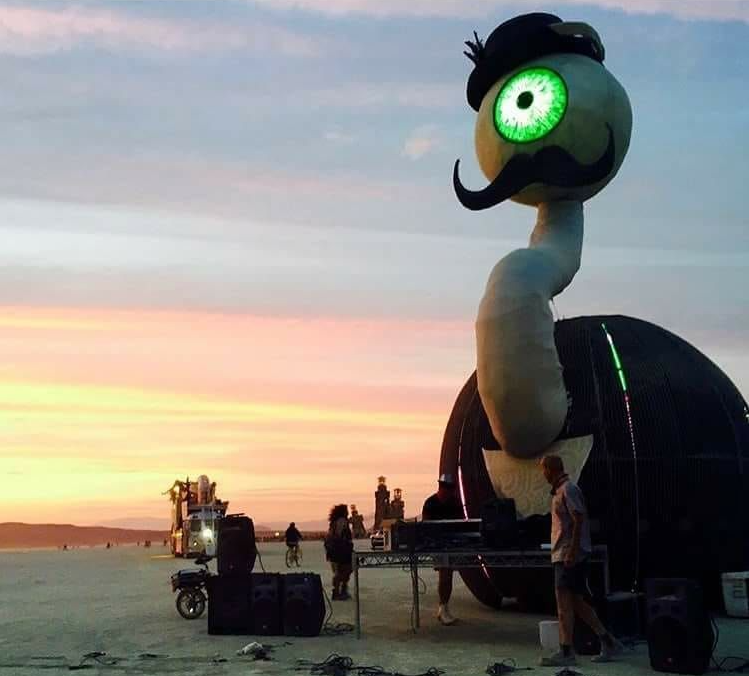 The design itself has a friendly, science fiction, cartoon-like feel. Despite its size, the toothless monster does not harm so much as look, wandering in search of pleasure and expression. Most of the time, its only goal is to find a place to circle up with Burners or humans and create a party, a family, and memories. With each passing year, a new look and feel to bring different experiences to the Playa.
